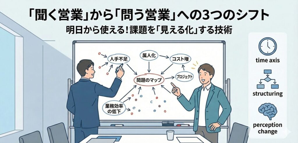 あなたが日々の商談で感じている「なんかズレてるな」というモヤモヤは、営業としての感度が高い証拠です。そのモヤモヤを「問い方」を変えるきっかけにして、お客さんと一緒に課題を発見する商談を、ぜひ試してみてはいかがでしょう。