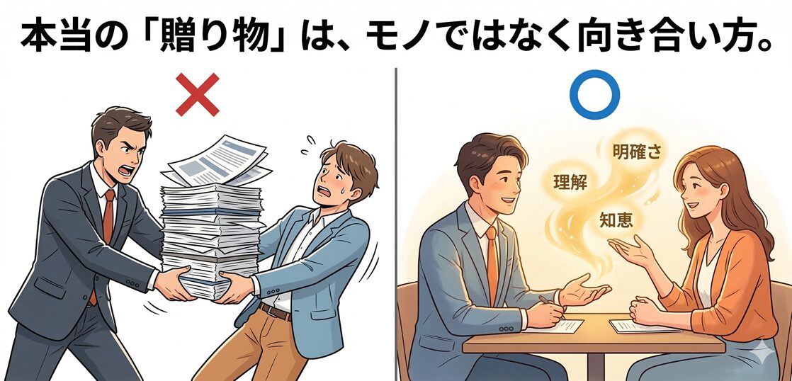 「贈り物」というと、分厚い提案書やノベルティなどを想像するかもしれません。でも、ここでいう贈り物は「モノ」ではなく、「お客さんへの向き合い方」のことです。