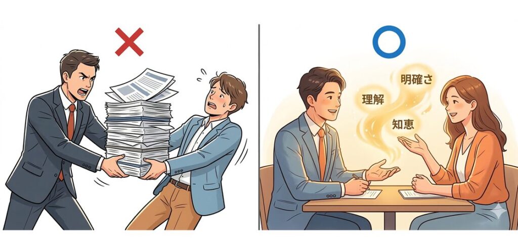 Wordやパワポの画面を一緒に見ながら、お客さんの意見をその場で書き足していくのもおすすめです。人は「自分が作るのに関わったもの」に愛着を持つと言われています(IKEA効果)。一緒に作り上げるプロセスそのものが、お客さんにとって価値ある「知恵の贈り物」になります。これはまさに、トライツがずっと大事にしてきた「顧客との共創」そのものです。